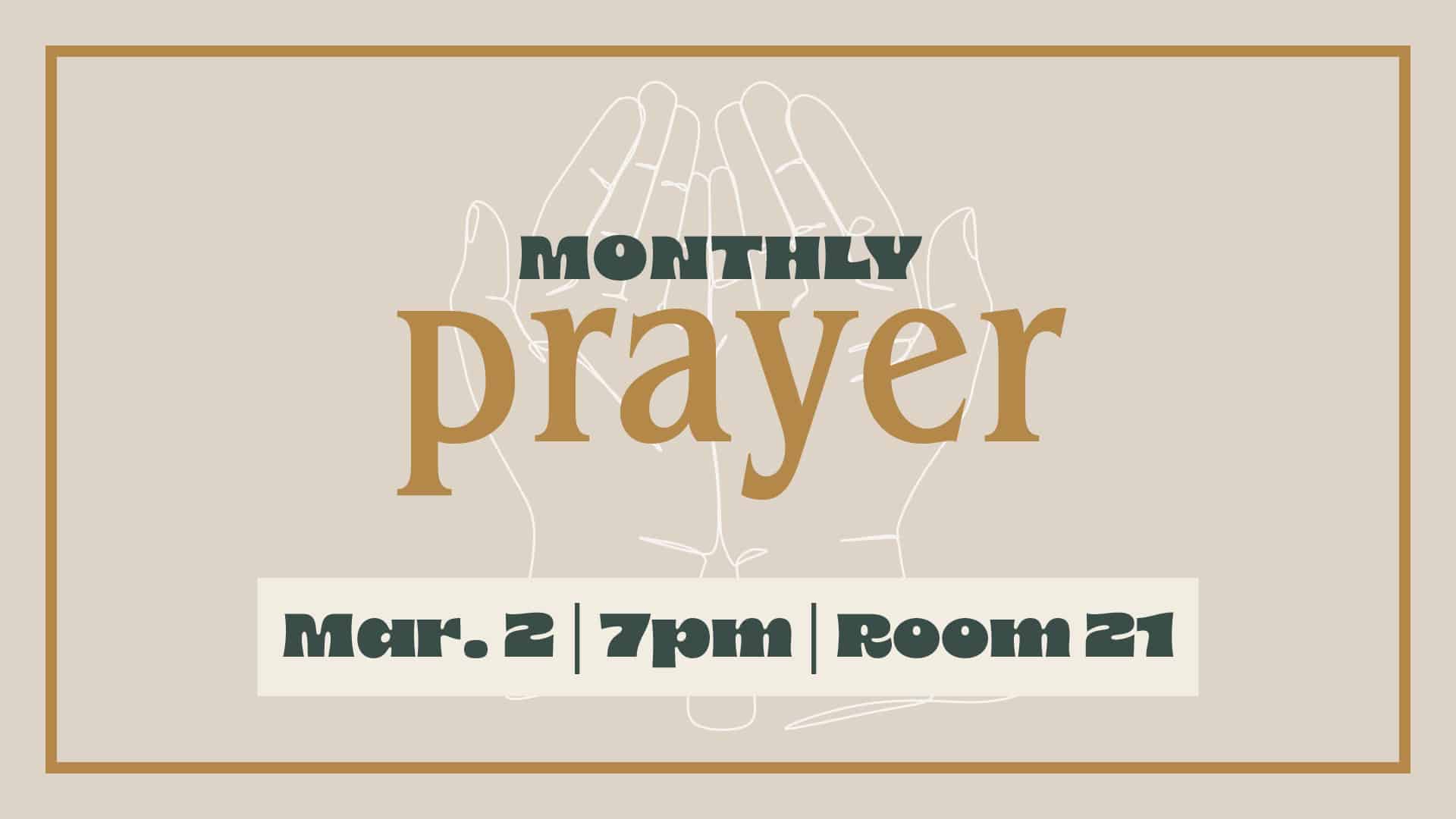 Join us for our monthly church prayer meeting, where we believe in the power of prayer and bring our requests before the Lord. We’ll gather on Monday, March 2, at 7:00 PM in Room 21 for an hour dedicated to seeking God together. Whether you’re lifting up personal needs or interceding for others, this is a meaningful opportunity to unite as a church family in prayer and praise. We look forward to praying with you!