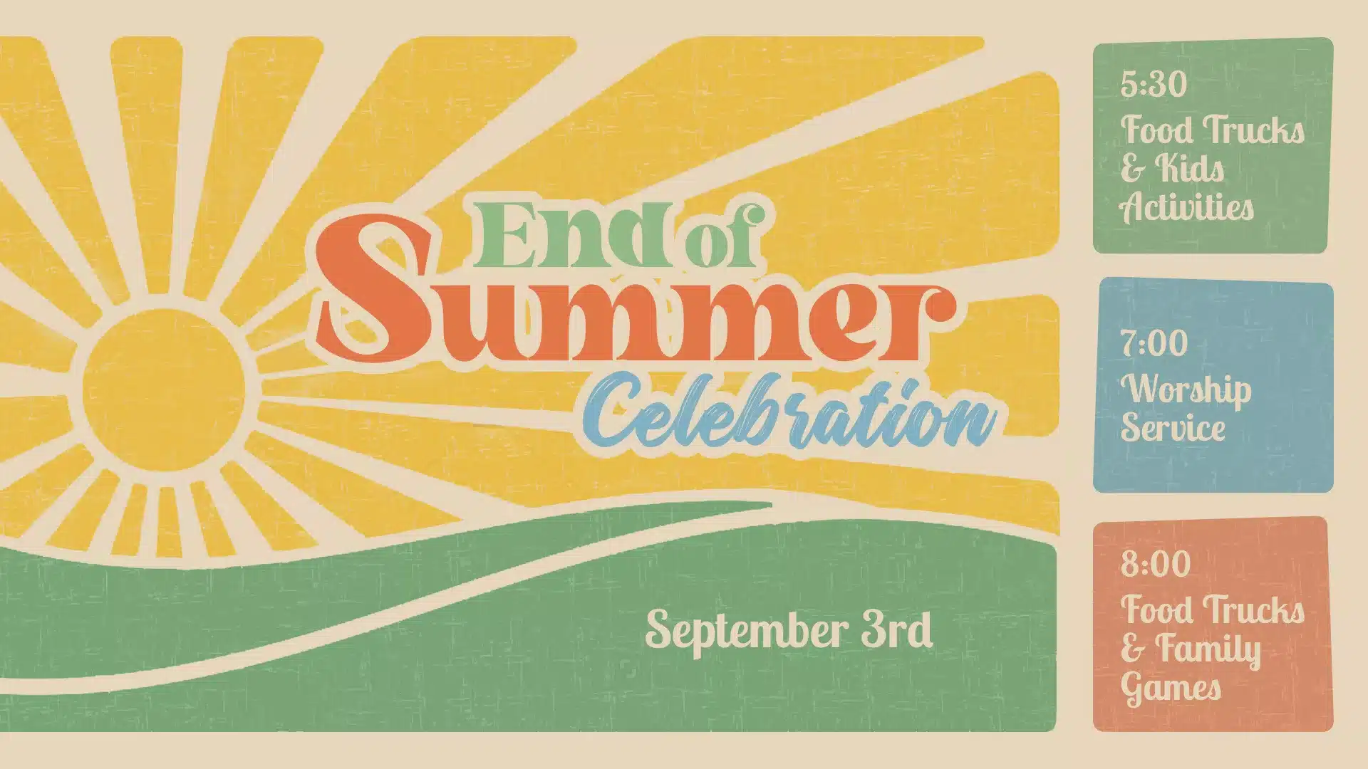 Join us for our End of Summer Celebration on Sunday, September 1, where we invite you and your family to be a part of the festivities. Starting at 4:30 PM, the kids’ activities will kick off, while the food trucks will be available for your family to purchase a delicious dinner. At 6:30 PM, we will gather for an outdoor service filled with worship and a message from God’s Word by guest speaker Pastor Art Reyes from Calvary Chapel Downey. Following the service, there will be more fun-filled family activities, and the food trucks will remain open until 8:30 PM. We are excited to see how the End Of Summer Celebration brings our church family together, so don’t forget to bring your chairs or blankets and get ready for a memorable time with us.