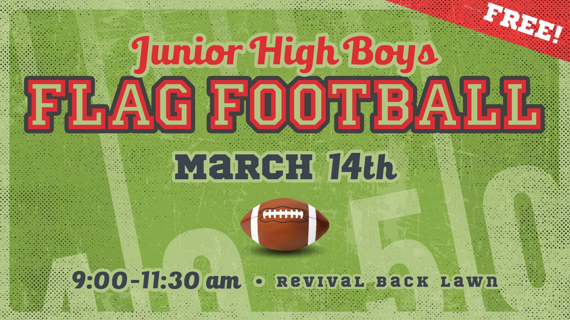 Get ready for an exciting morning, Jr. High Boys! Join us on Saturday, March 14, from 9:00 to 11:30 AM, on the back lawn at Revival for a fun-filled game of Flag Football. This is your chance to enjoy time outdoors, connect with friends, and share in the spirit of friendly competition. Make sure to wear your athletic shoes and bring a water bottle to stay hydrated. Don’t miss out on this eventful day—we can’t wait to see you there!