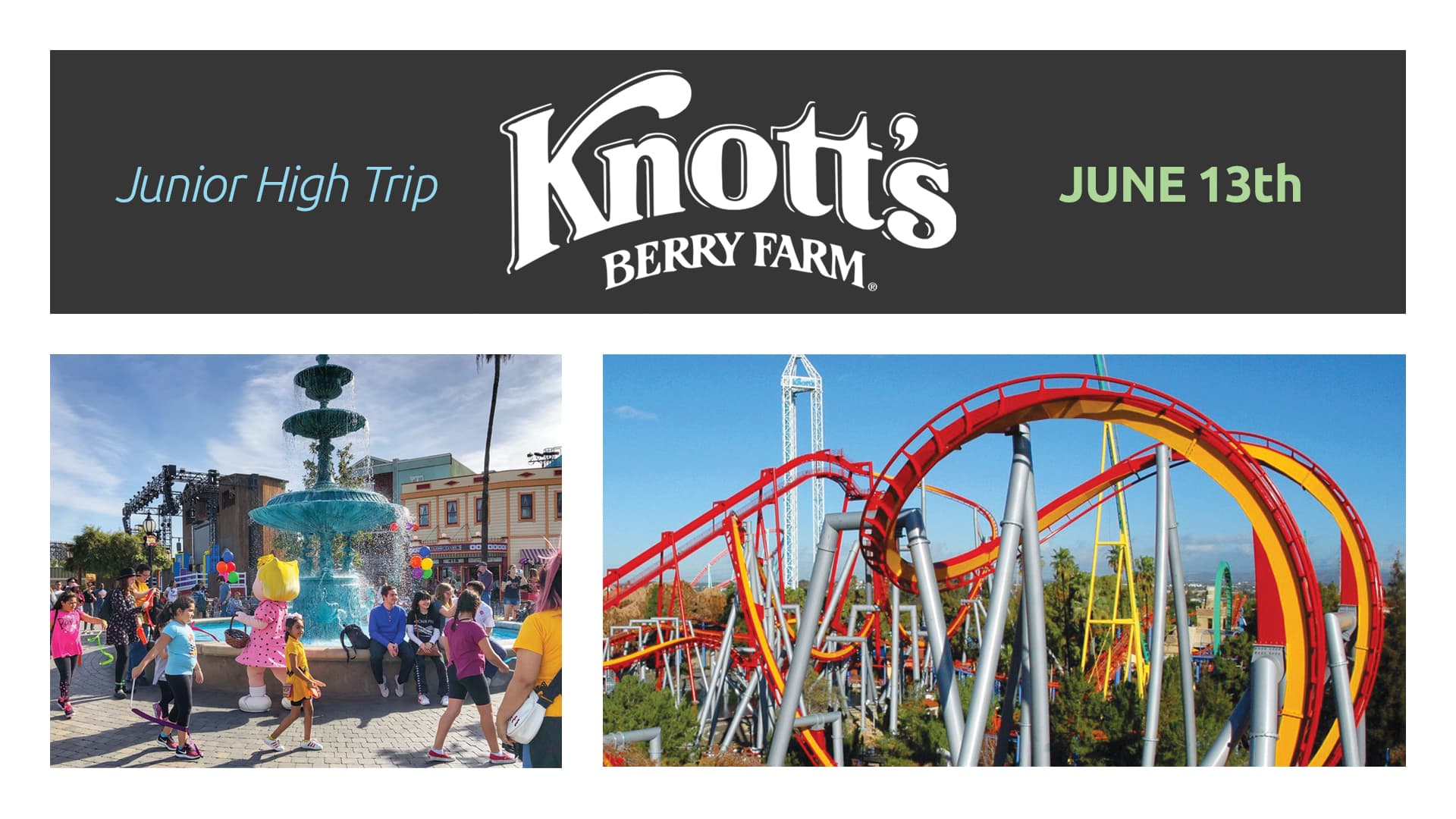 Jr. High students, it’s time to get excited! On Friday, June 13, we are going to Knott’s Berry Farm. We’ll meet at Revival at 7:30 AM and return at 10:30 PM. We’ll be spending the day at the park, so make sure to bring water and snacks to keep you hydrated and energized throughout the day. Also, remember to bring some money for souvenirs or to buy food at the park. Tickets are $75 for this great day of fun and adventure, so don’t miss out!