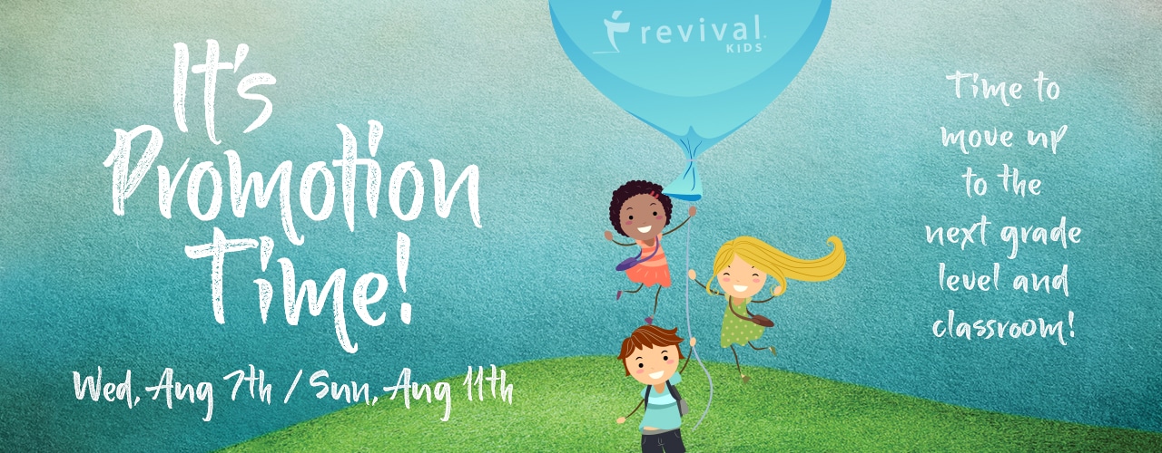 Promotion The new school year is almost here — so it’s time for all our kids to move up to their new grade-level classes on Wednesday, August 7 and Sunday, and August 11. Posted: July 24, 2019 Ministries: Revival Kids Categories: Children